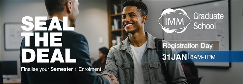 Whether you are a recent school leaver eager to start your first qualification, or alternatively a working professional looking to advance your career, the IMM Graduate School Registration Day on Saturday, 31 January 2026, from 08:00–13:00, offers the perfect opportunity to receive personalised support, finalise your enrolment, and secure your place for Semester 1 starting on 9 February 2026.